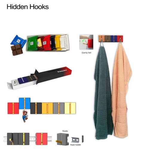 Hidden Hooks設計靈感來自巧克力和積木,采用卡套設計,使多個掛鉤能像積木一樣組裝,加上多彩的設計,一方面增加用戶的拼搭樂趣,另一方面豐富了墻面裝飾。