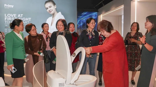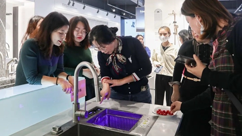在集團領導陪同下,女企業家們參觀了普樂美展廳,感受普樂美不銹鋼水槽、不銹鋼龍頭、智能座便器、浴室柜等產品的獨特魅力,并親身體驗榮獲“2020紅鼎創新功能TOP10”獎的水槽解毒機的強大功能,對這款科技智能、環保安全的產品給予了高度肯定。